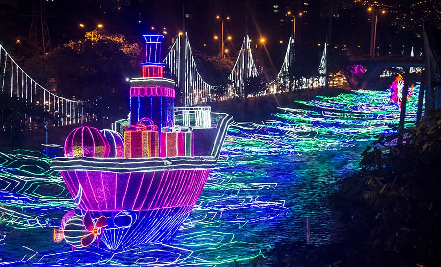Aquí caminarás por senderos llenos de figuras luminosas, pasajes temáticos y espectáculos de luz que se reflejan sobre el río Medellín.